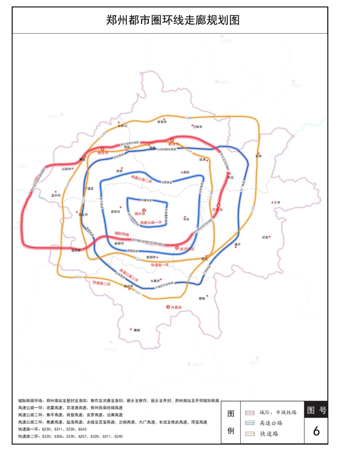 轨道交通1环:郑州至洛阳、焦作至济源至洛阳、新乡至焦作、新乡至开封、郑州南站至开封等轨道交通形成的环线。高快路网5环:连霍、京港澳、郑州西南绕城高速组成的高速公路一环,焦平、商登、安罗、沿黄高速连接形成的高速公路二环,焦唐、盐洛、永城至灵宝、兰南、大广、长垣至修武、菏宝高速连接形成的高速公路三环。G230、S311、S235、G343连接形成的快速路一环和S220、S306、S230、G207、S320、G311、G240连接形成的快速路二环。