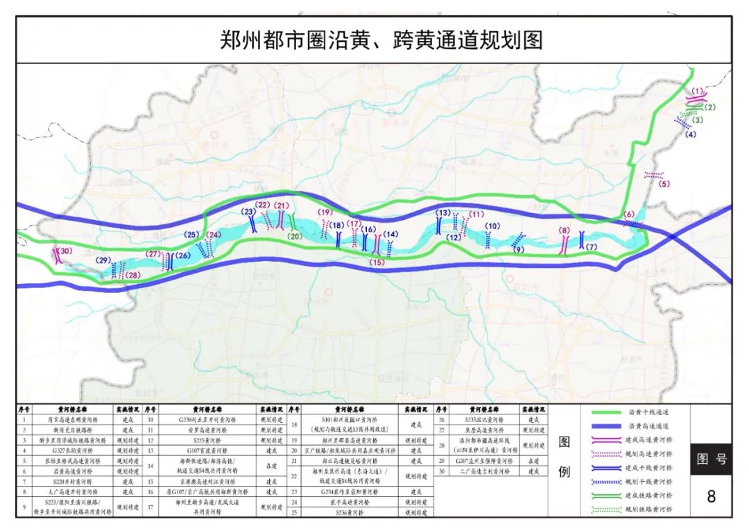 高快路网8条:既有连霍、郑民高速和郑开大道、郑汴物流通道(S314)、原G310等5条,规划沿黄公路(S312)、科学大道、G310南移等3条。