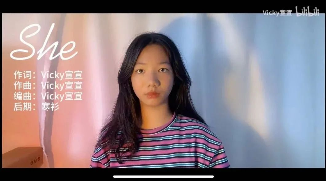 网名“Vicky宣宣”的B站UP主张宇宣,凭借一首原创英文歌曲《She》,几天之内火“出圈”。这位只有15岁的“深圳女孩”说,这首歌源自自己上课时的一次“灵感爆棚”。