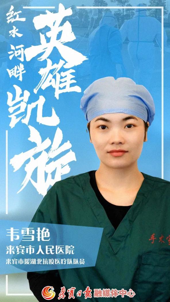 一起来认识一下咱们的韦雪艳吧↓↓韦雪艳是我市首批援鄂抗疫的医护人员,也是广西第二批援鄂抗疫医疗队员。2020年2月4日,她与其他队员一起从南宁出发武汉,到达武汉后,经过岗前感控培训,进入武汉市武昌方舱医院,负责医院轻症病人的护理工作。3月10日,武昌方舱医院正式关闭,她与队友又投入到另外的救治工作中直至3月20日。4月3日,她们结束在南宁14天的隔离观察,启程回到来宾。