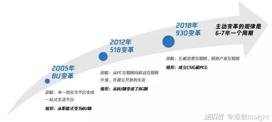 从2005年的“BU变革”,到2012年的“518变革”,再到2018年的“930变革”,腾讯的组织变革总是每6-7年一个周期,对应于社交平台、移动互联网、产业互联网的时代浪潮。