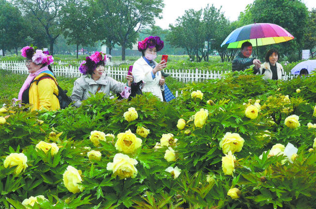 “雨中赏花别有一番风味!带着雨珠的牡丹花更加圆润饱满,色泽也更加光鲜亮丽。牡丹的花香夹杂着泥土的清香,直入心田,让人心情舒畅。”济宁游客李珍说。