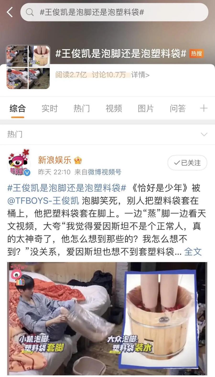 90后、00后已经开始养生了。近日,95后艺人王俊凯就因为“泡脚”冲上了热搜。在最近的一档真人秀节目中,王俊凯“脚套塑料袋泡脚”的一幕引发热议,网友们纷纷调侃,“这是泡脚还是泡塑料袋呢”?