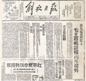 1944年6月13日 延安《解放日报》刊登报道:《接见记者团席上毛主席畅谈国内外局势》毛泽东在《解放日报》的一篇社论中写道:“关于共产党的真相究竟如何这一方面,大多数的外国人与大后方的中国人,还是不明白的……”“但是事实胜于雄辩,真理高于一切,外国人中国人的眼睛,总有一天会亮起来的。现在,果然慢慢地亮起来了。”雄鸡一唱天下白。在中外记者团的正义报道下,“所有对八路军污蔑的谣言已被事实所粉碎,任何封锁都已封锁不住了”,一个真实的共产党正用坦荡、磊落的襟怀,开放、自信的心态,拨云见日,步入世界舞台。