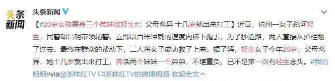 杭州一名20岁女孩欲跳河轻生,因自己一个人要养活两个妹妹一个弟弟,不堪重负。并称“已不是第一次有轻生的念头”。