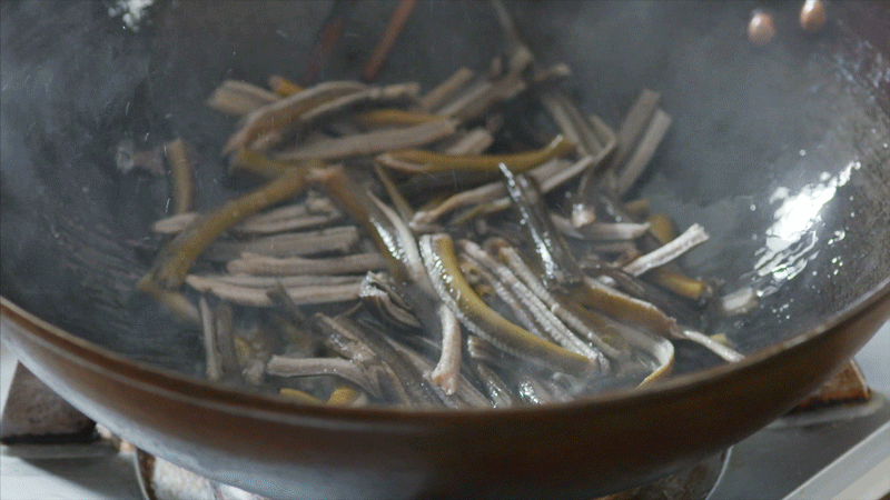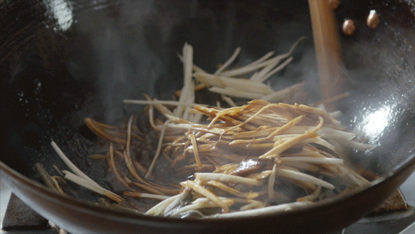 热锅冷油,姜片、葱段爆香后捞出。鳝丝沥干水分,下锅划散,随后放入茭白丝,翻炒均匀。