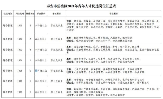 泰安市岱岳区2021年青年人才优选岗位条件、优选人数等具体要求见《泰安市岱岳区2021年青年人才优选岗位汇总表》。