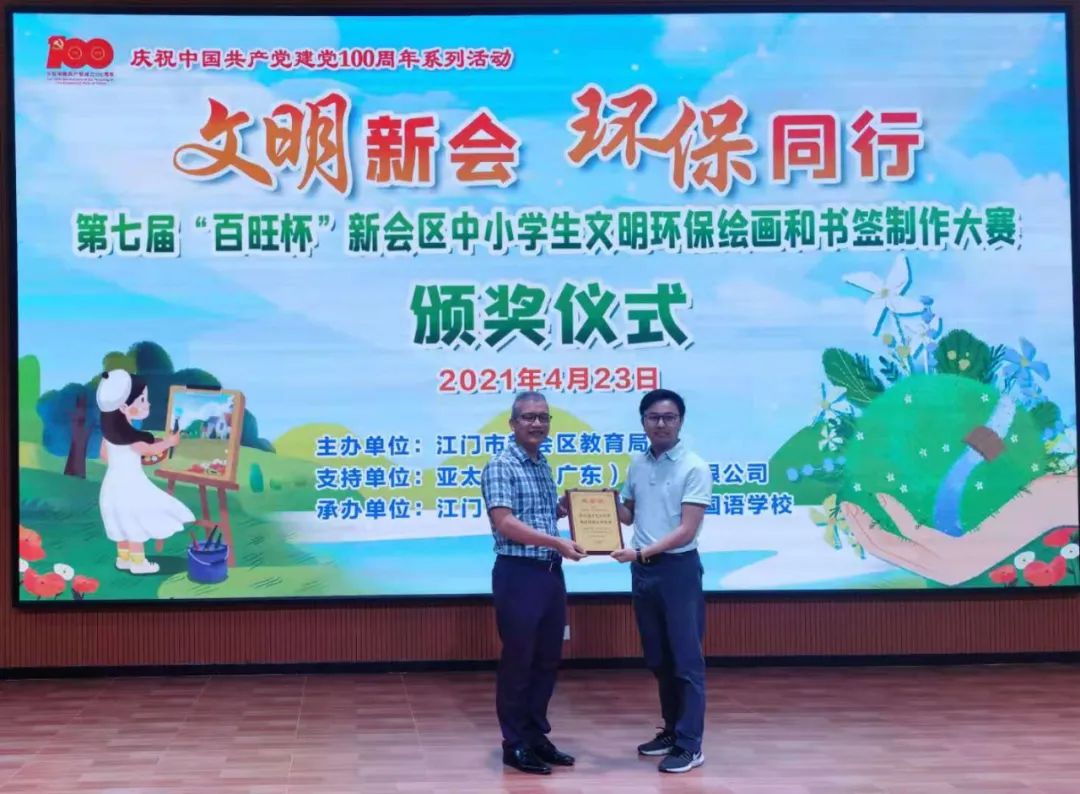 作为活动的支持单位,亚太森博(广东)纸业有限公司是新加坡金鹰国际集团旗下公司,坐落于双水镇,主要从事高档文化用纸的生产和销售。该公司坚持经济效益和社会效益相结合,积极投身救灾、文化、教育、扶贫、环保等领域的社会公益事业。为了感谢该公司持续多年关注、支持新会区教育事业,大赛总结会上,新会区教育局向连续7年赞助环保绘画大赛活动的亚太森博(广东)纸业有限公司颁发感谢状。