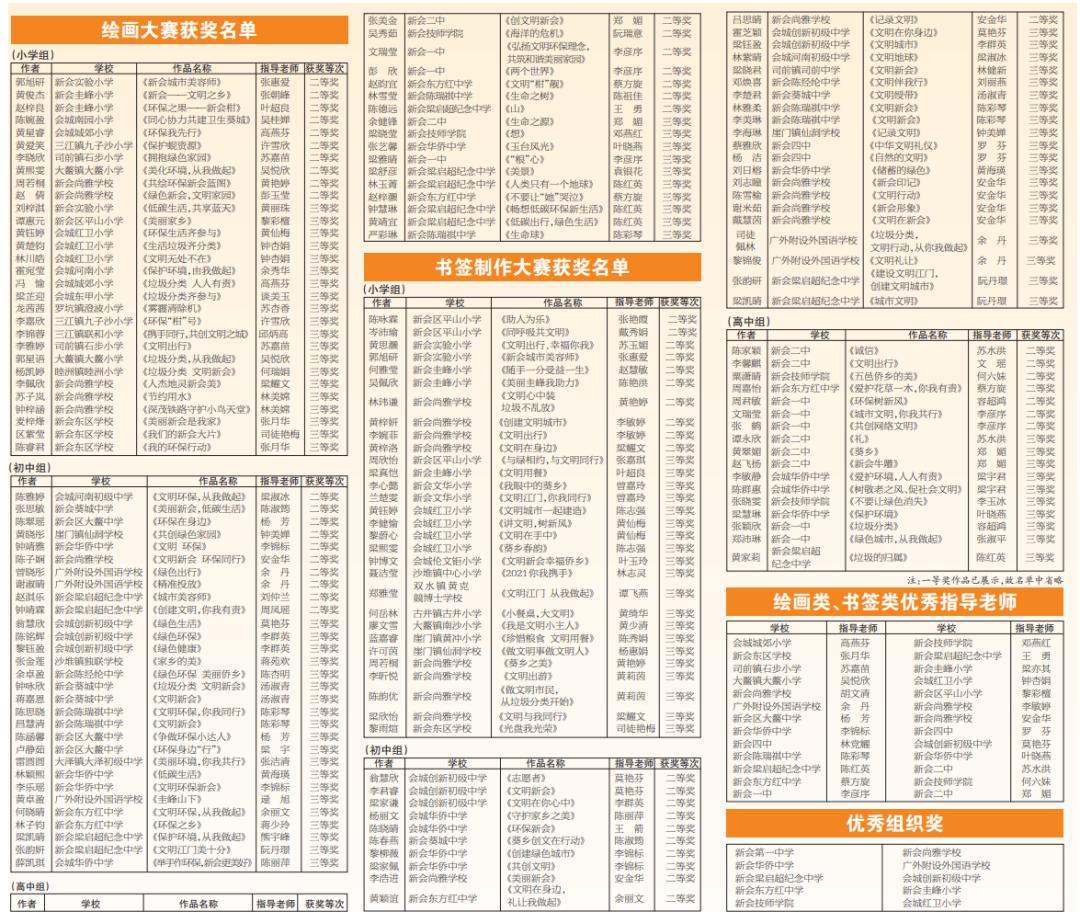 本次大赛受到了广大师生热捧,组委会共收到各学校选送的环保绘画515份,文明书签 590份。经专业评委评选,最终评出一等奖26个,二等奖55个,三等奖100个,优秀奖240个,同时评出30位优秀指导老师、10个优秀组织单位,全方位展示了新会区中小学生的艺术水平。