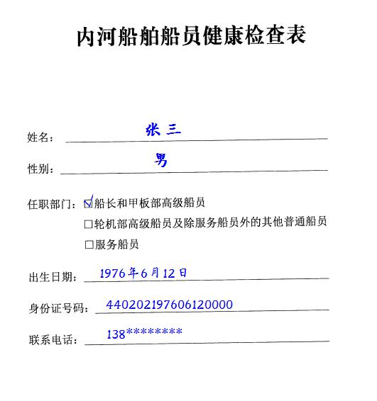 2、船员信息栏填写船员姓名、性别、年龄、任职职务均应如实告知医师,填写完整。其中任职职务栏应与所申请适任证相符。按职务填船长、大副、驾驶员、轮机长、大管轮、轮机员、普通船员等。