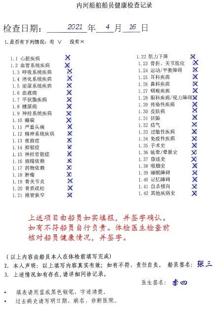 1、第三页的内容是船员身体健康情况申明,由船员对所列的1.1-1.42项情况进行申明,按有打√,没有打×,如实填写,如有不符,由船员本人负责。