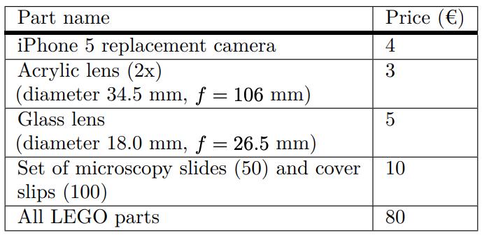成本的大头是散装乐高零件,预算在 80 欧元左右,此外还需要一个 iPhone 5 替代镜头、丙烯透镜、玻璃透镜、载玻片等。总价算下来 100 欧元左右,也就是不到 800 元人民币。由于乐高不提供光学元件,所以需要提前购买一些镜头零件,当前配置中使用了 3 种类型的附加镜头: