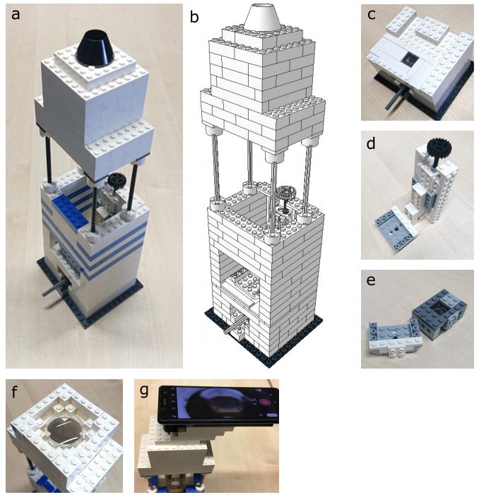 (图注)乐高显微镜整体设计图。(c)是从下方照亮样本的 LED,(d)是通过移动物镜调整显微镜焦距的螺纹系统;(e)是两个物镜,包括一个焦距为 3.85mm 的替换智能手机镜头 (左) 和一个焦距为 26.5mm 的玻璃镜头(右) ; (f)由两个丙烯镜头组成; (g)是改装后的目镜,此处智能手机可以用作照相机。