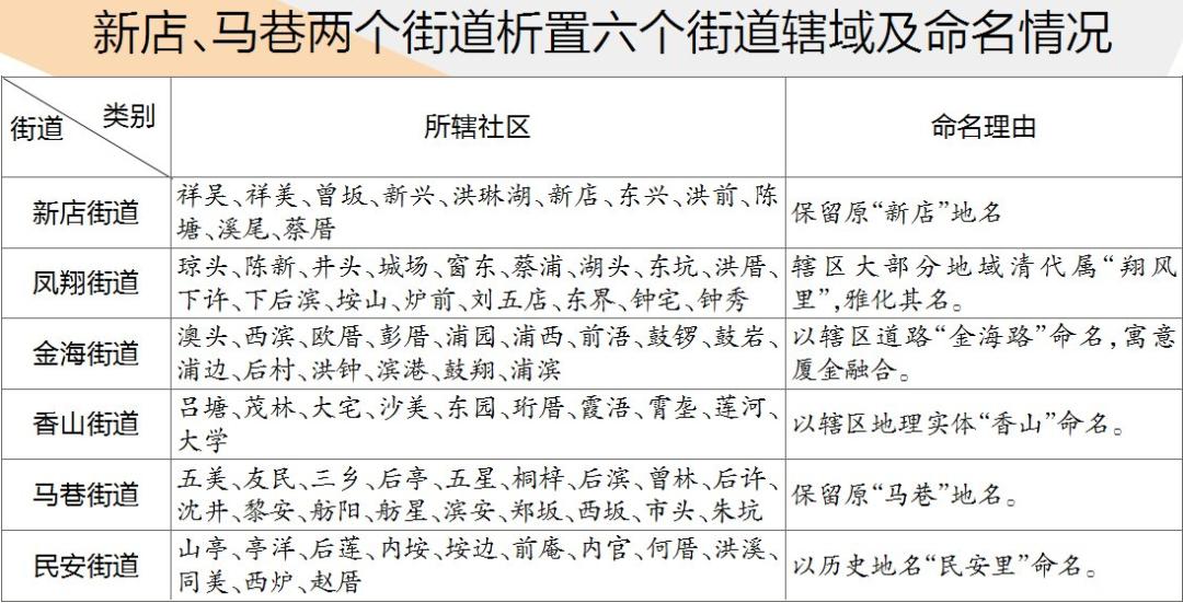授牌后,六个街道办事处正式启动运转。行政区划调整后,翔安区辖7街2镇,即新店、凤翔、金海、香山、马巷、民安和大嶝共七个街道,内厝和新圩共两个镇。各办事处地址和联系电话