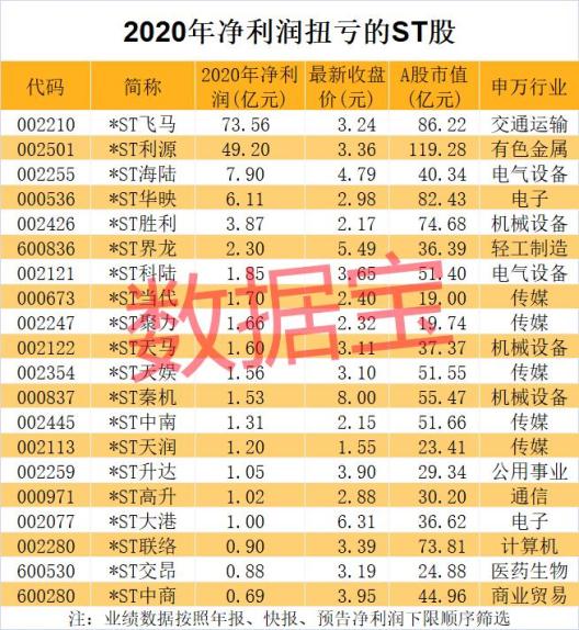 从已公布的年报、快报、预告净利润下限数据来看,2018年、2019年净利润连续亏损,2020年扭亏的ST股共有54只。*ST飞马、*ST利源、*ST海陆、*ST华映、*ST胜利、*ST界龙等净利润有望达到2亿元以上。