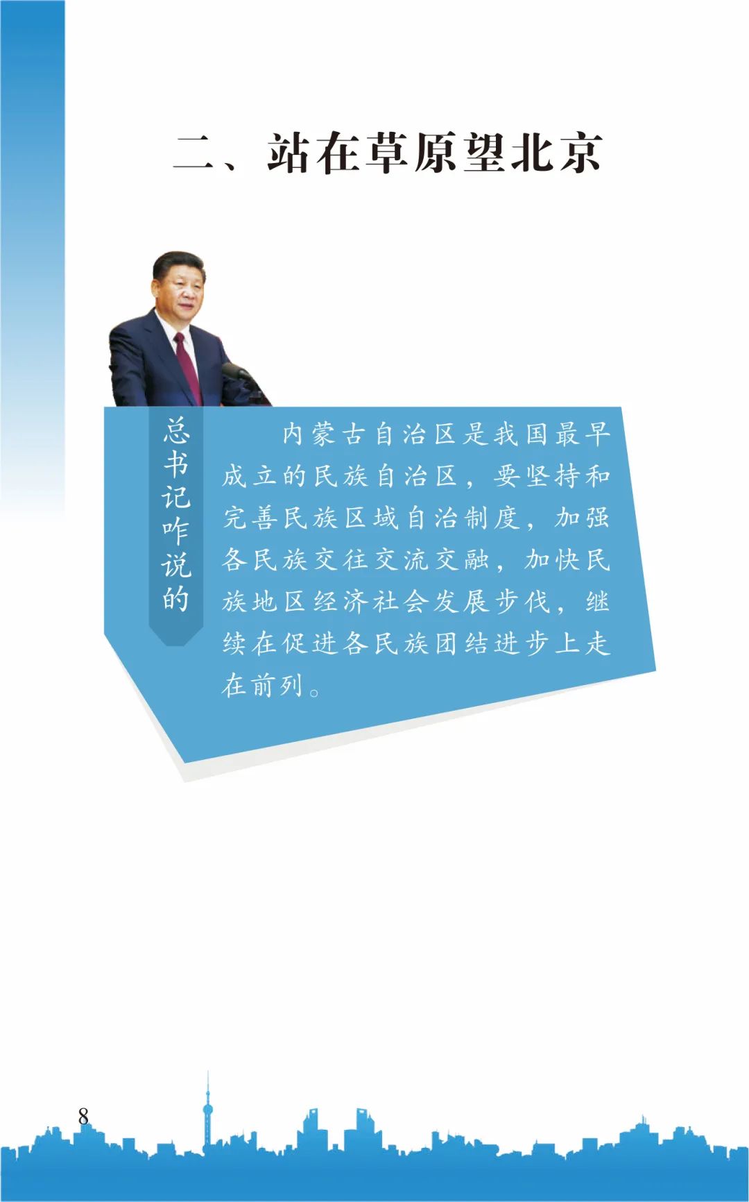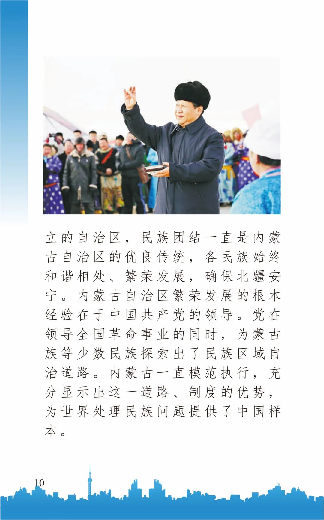 《内蒙古自治区促进民族团结进步条例》宣传手册 2021年1月30日,内蒙古自治区第十三届人民代表大会第四次会议通过了《内蒙古自治区促进民族团结进步条例》(以下简称《条例》),这是我区首次出台促进民族困结进步工作的综合性、地方性法规,填补了自治区地方立法工作的一项空白。为帮助全市广大干部群众深入学习领会《条例》的精神实质,铸牢中华民族共同体意识,切实推进《条例》内容入脑入心自觉践行,通辽市委宣传部组织编写了《条例》分众化宣传手册,分为党员干部篇、农牧民篇、城镇居民篇、青少年篇、问答篇。
