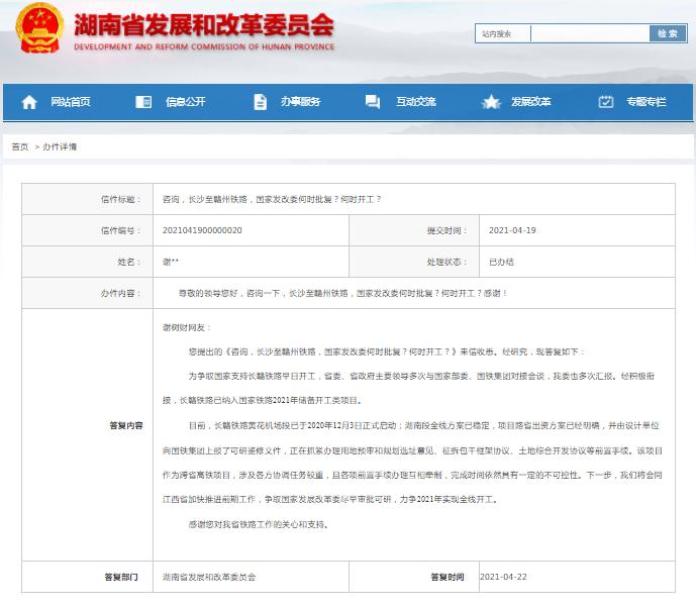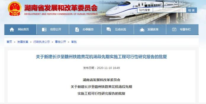 湖南省发改委官方这样回复:为争取国家支持长赣铁路早日开工,省委、省政府主要领导多次与国家部委、国铁集团对接会谈,我委也多次汇报。经积极衔接,长赣铁路已纳入国家铁路2021年储备开工类项目。