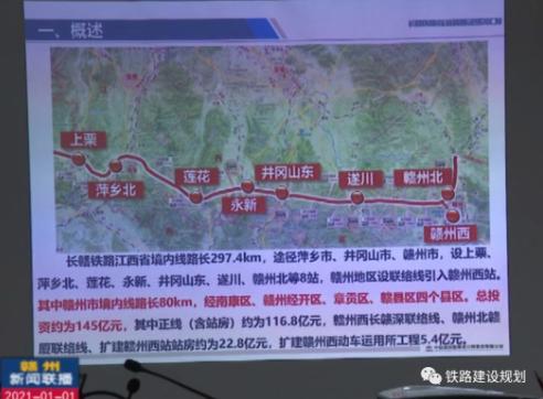 长赣铁路是国家高速铁路网“八纵八横”之一渝长厦通道的重要组成部分。线路自湖南长沙西站引出,途经黄花机场、浏阳市,终至江西赣州市,设计时速350公里,项目湖南段长约115公里,总投资预计204亿元。据悉,长赣铁路江西省境内线路长297.4公里,途经萍乡市、井冈山市、赣州市,设上栗、萍乡北、莲花、永新、井冈山东、遂川、赣州北等8站,赣州地区设联络线引入赣州西站。