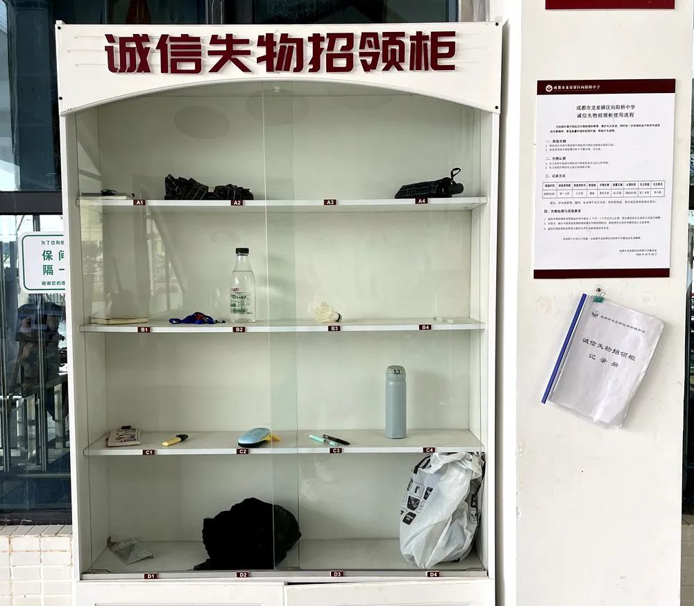 这个柜子到底是什么呢?同学们为啥都到这儿来呢?它就是向阳桥中学第一个——诚信失物招领柜。诚信柜分为四层,每层四个区域,每个区域都有其对应编号,放在旁边的小本本就是信息记录册,同学们捡到或认领失物时,就会通过编号进行登记。