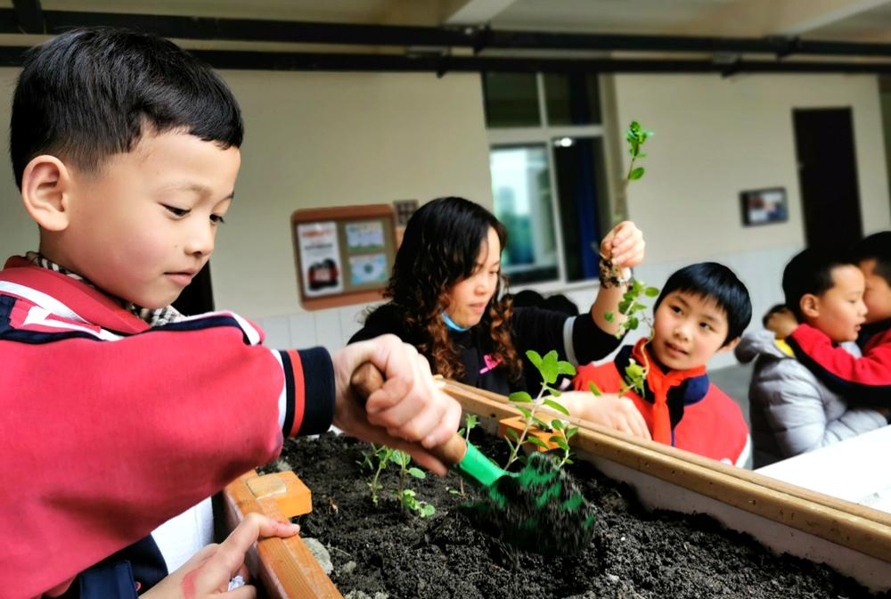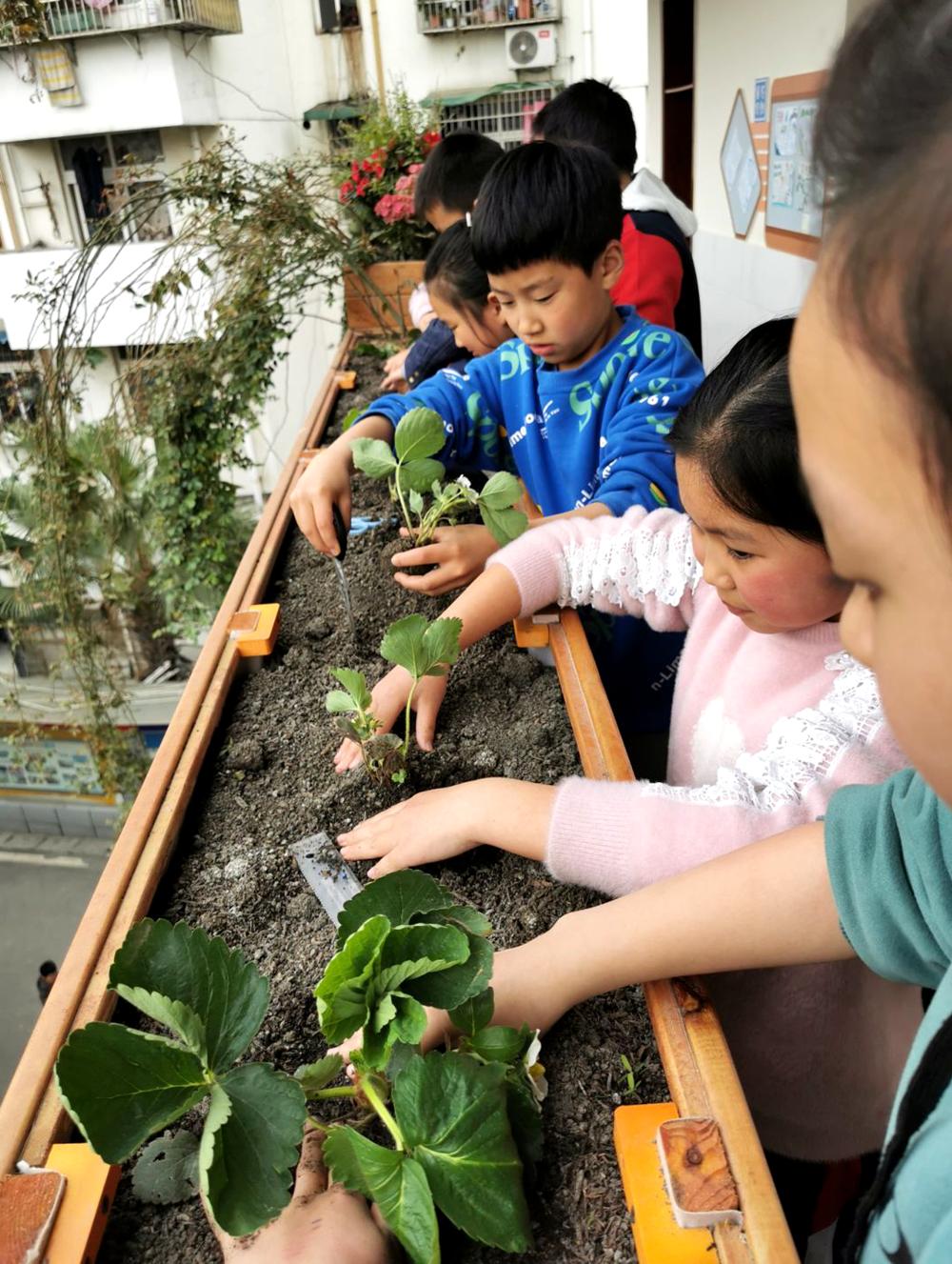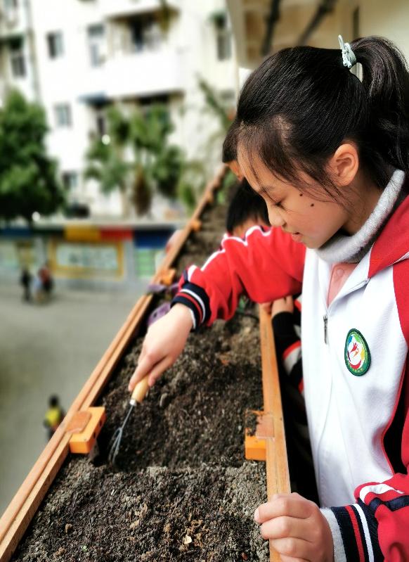 在龙泉驿区十陵小学校教学楼的楼道上,有一排长长的围栏,围栏里长满了五彩斑斓的鲜花、绿植和蔬菜。每到课间时分,总有三三两两的小朋友出现在这些围栏前,他们或拿着水壶给这些植物浇水、给蔬菜疏苗、给绿植施肥,他们专注地观察着这些“小生命”的成长,自主的守好自己的“一亩三分地”。