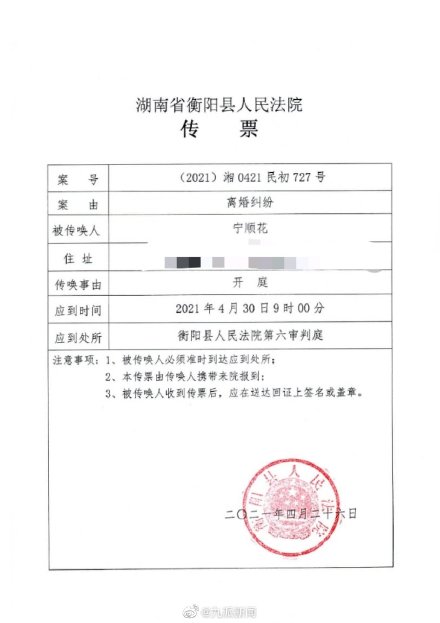 @九派新闻 4月26日消息,当日,宁顺花接到衡阳县法院通知,称她收到法院传票,其起诉离婚开庭时间定在本月30日9时。她说将赶回衡阳,出席此次庭审。这次开庭原本定于23日,其丈夫陈定华于4月17日被执行行政拘留十日,他向法院申请延期开庭,要求等他被释放后进一步收集证据,所以开庭日期延期。这是宁顺花5年内第5次起诉离婚,早前4次均遭驳回。