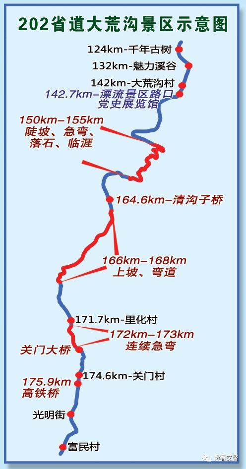 4.202省道通往大荒沟景区方向:124公里至182公里全程道路狭窄、坡陡、路弯; 150公里至155公里处连续急转弯!行经此路段时请注意安全、减速慢行。
