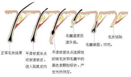 因为激光穿透皮肤后,会选择性地被黑色素颗粒吸收,产生光热效应,将毛球及干细胞彻底破坏,从而让毛囊凝固坏死,达到毛发脱落的最终效果。