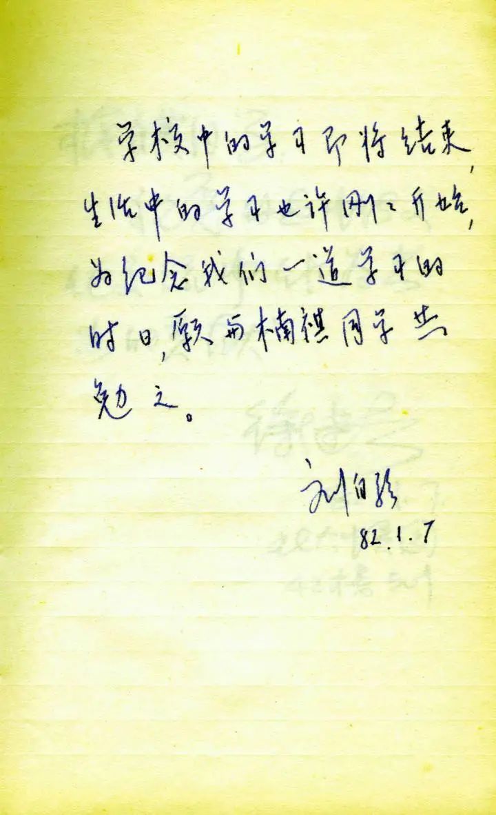 刘子强老师给刘楠祺的毕业赠言,1982年1月。现代派文学巨擘、象征派诗歌先驱的波德莱尔,已经去世100多年了,但当时在国内还没完全被接受,当时北大里有人称他是“颓废派的诗人”,刘自强教授讲座结束,还有人上台去消毒!但刘教授不理睬,她觉得学生需要知道波德莱尔,这位世界上影响广泛的诗人。