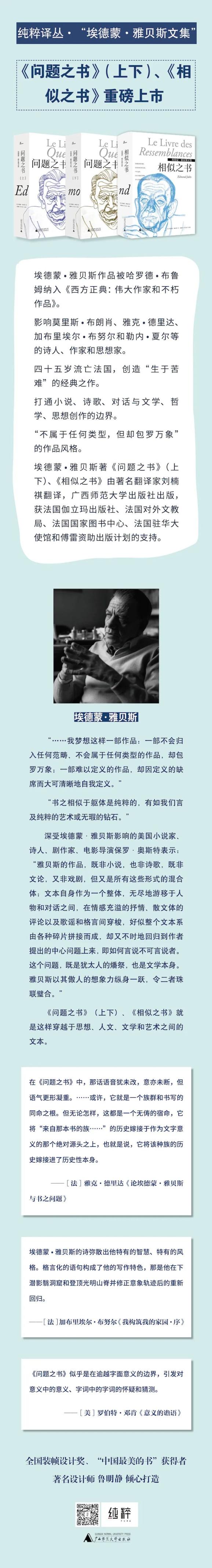 作品被列入西方正典,法国著名思想家埃德蒙·雅贝斯著作“埃德蒙·雅贝斯文集”之一《相似之书》中文版首次面世。共分为三卷,分别是“相似之书”“暗示·荒漠”和“不可磨灭·不能察觉”。书中充满了雅贝斯式的哲学思索,从语言到文学,从宗教到传统,焦虑与困扰在作者灵魂的拷问中不断明晰、坚定。纯粹译丛之“埃蒙德·雅贝斯作品系列”重要作品之一。
