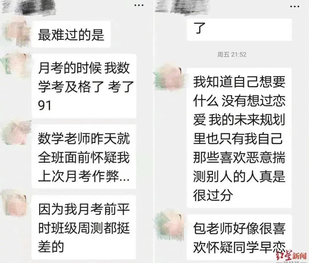 随后,媒体曝光了欣欣和朋友的聊天记录,里面多次提及老师对欣欣的怀疑和伤害——