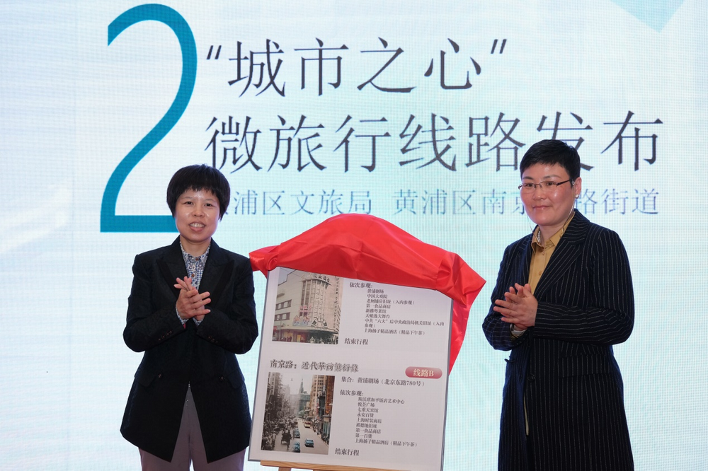 黄浦区文旅局副局长王莉和黄浦区南京东路街道副主任茹蕾现场揭幕微旅行线路。