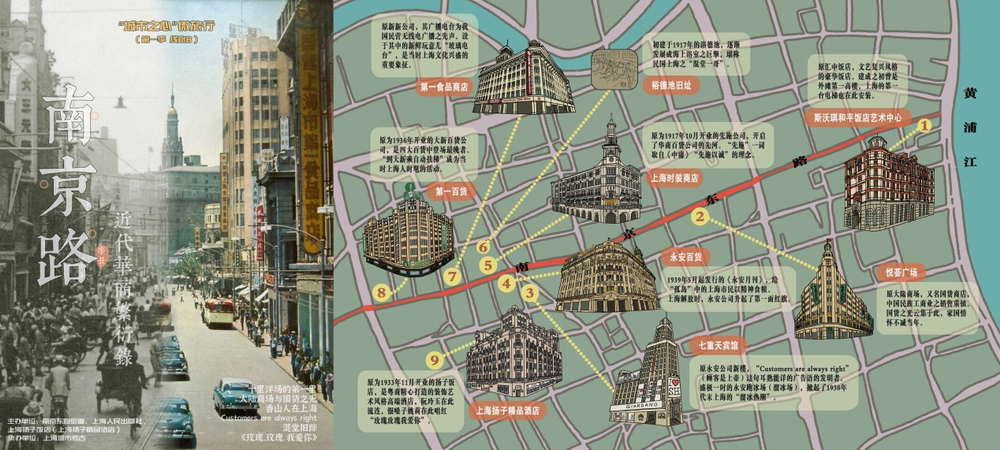 路线:斯沃琪和平饭店艺术中心-悦荟广场-七重天宾馆-永安百货-上海时装商店-裕德池旧址-第一食品商店-第一百货-上海扬子精品酒店