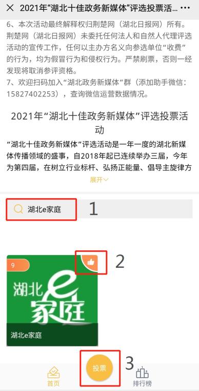 首页下拉至搜索框,输入“湖北e家庭”,或点击“省直微信”选择9号“湖北e家庭”,点击右上角大拇指图标,再点击“投票”,即完成投票。