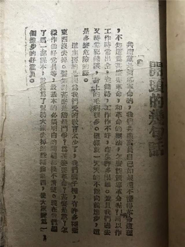 在李卫国的众多收藏中,他最珍视的文献是一本小册子,是中共胶东区党委宣传部1945年12月印制的党员课本第二册《革命一定能成功》。书中开篇明义:共产党是领导革命的,我们共产党员自己如果还不懂得革命道理,不知道为什么要革命,和革命的想法,怎么能领导革命呢?