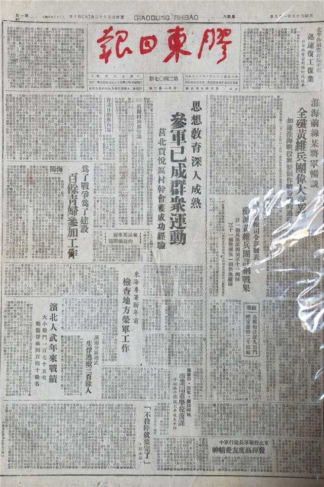 “威海是一座英雄的城市,天福山起义打响胶东抗日救国的第一枪。”李卫国说,在胶东新华书店1947年7月份出版的《纪念日手册》中,详细记录了39个重大纪念日,涉及地方的只有天福山起义纪念日,足见红色胶东在中国革命中发挥的有力作用;在1946年9月5日出版的《群力报》中刊登了《乳山县的运粮办法好》一文,点评乳山县运粮支援前线作战的计划周密,及时保障了部队供给,运粮队伍和牲口未受损失,讲述了人民军队为人民、人民军队靠人民的实事。