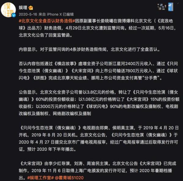 在该巨亏公告发布的同日晚间,世纪伙伴原控股股东娄晓曦在微博发声,实名举报北京文化财务造假。