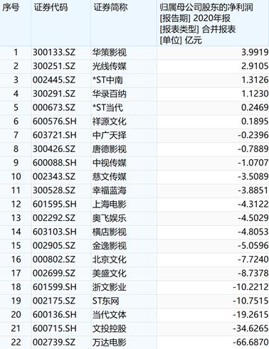 Wind数据显示,截至4月27日,已发布2020年业绩的影视行业公司中,仅华策影视、光线传媒2020年的净利润超过1.6亿元。行业内,超七成公司2020年净利润为负,其中万达电影净利润亏损预计达66.68亿元。