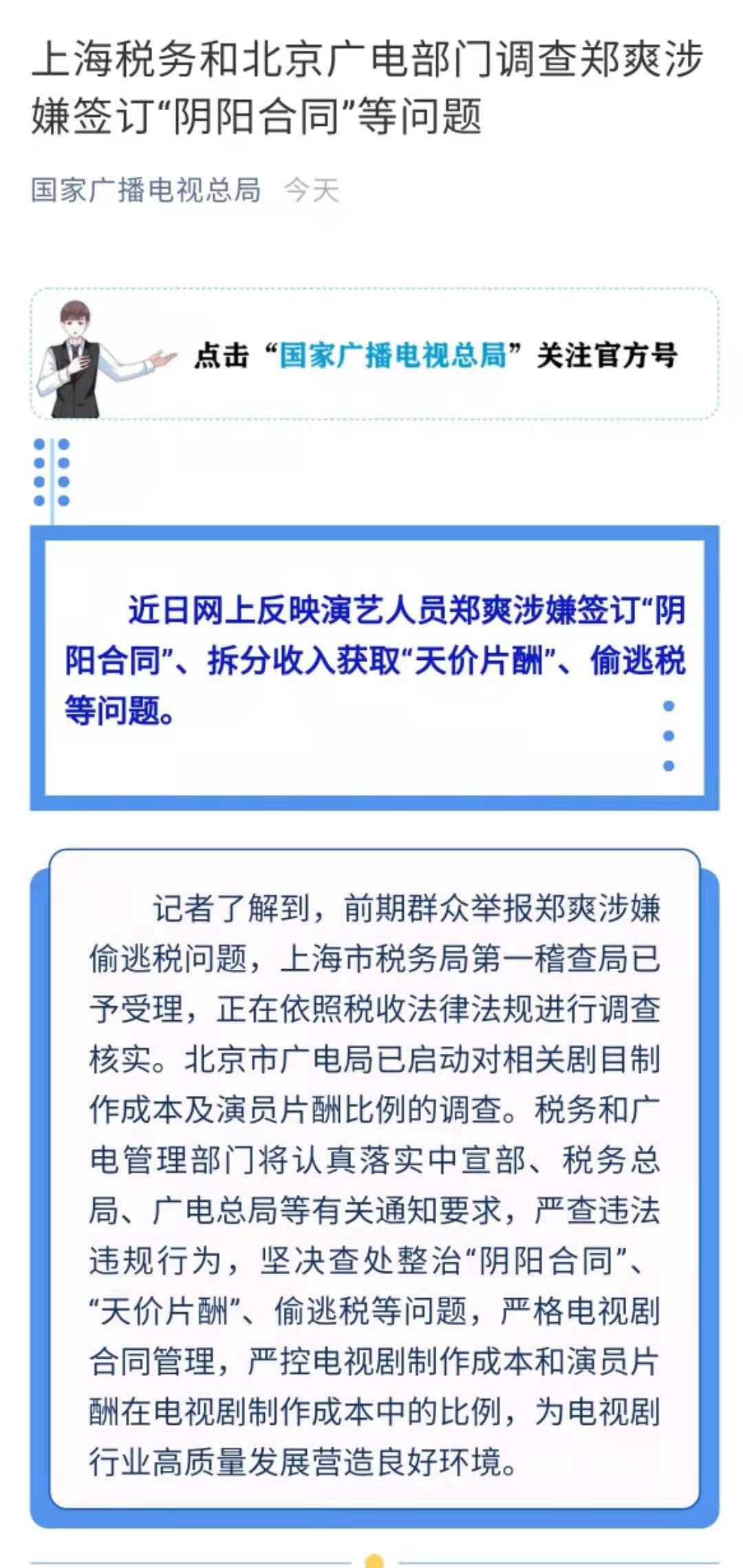 最后,这部戏与郑爽签订了一份4800万元的“阳合同”,然后伴随一份对郑爽母亲实控公司—上海晶焰沙增资1.12亿元的“阴合同”,以此躲避限薪令。微博末尾,还特别@国家税务总局。