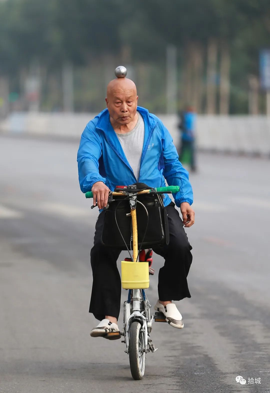 沈阳- 2019年6月5日,一位骑车老人头顶钢球进行健身锻炼。拾城 田卫涛