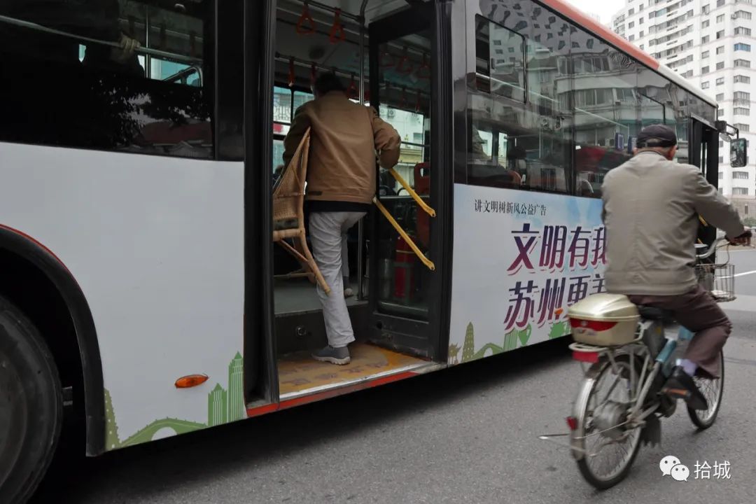 苏州(江苏)- 2017年10月19日,人民路,一位阿伯自带椅子上公交。社会老龄化趋势已经不是让座就可以解决的问题了,而自备“专座”亦存在不少安全隐患。拾城 倪黎祥