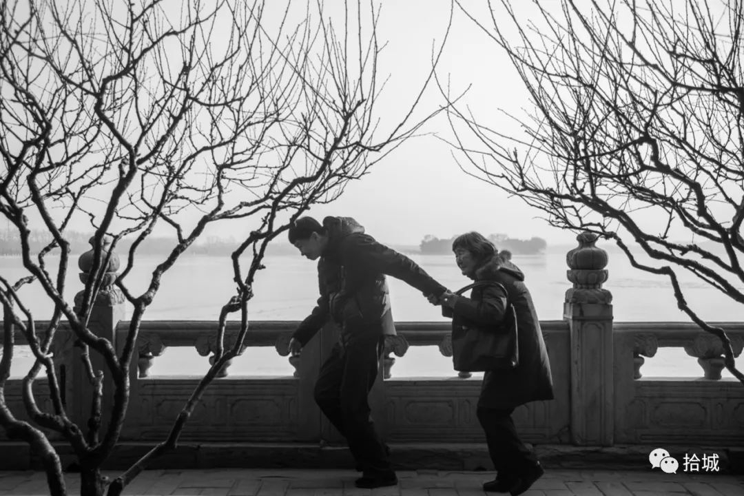 北京- 2017年12月2日,43岁的智残人士钟进(左)在公园里拉着73岁的母亲钟震跑了起来。随着年龄的增长,钟震对自己离世后儿子的去向十分担心。拾城 夏天