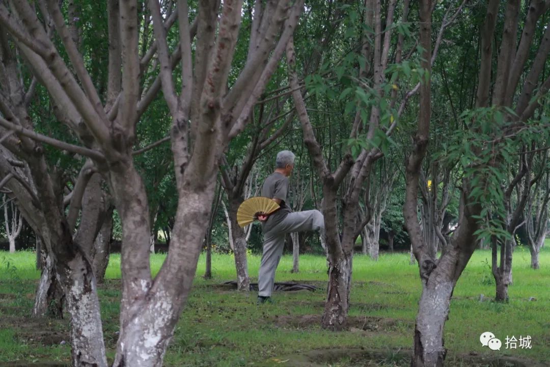 北京- 2020年8月16日,公园里压腿的老人。拾城 米度克