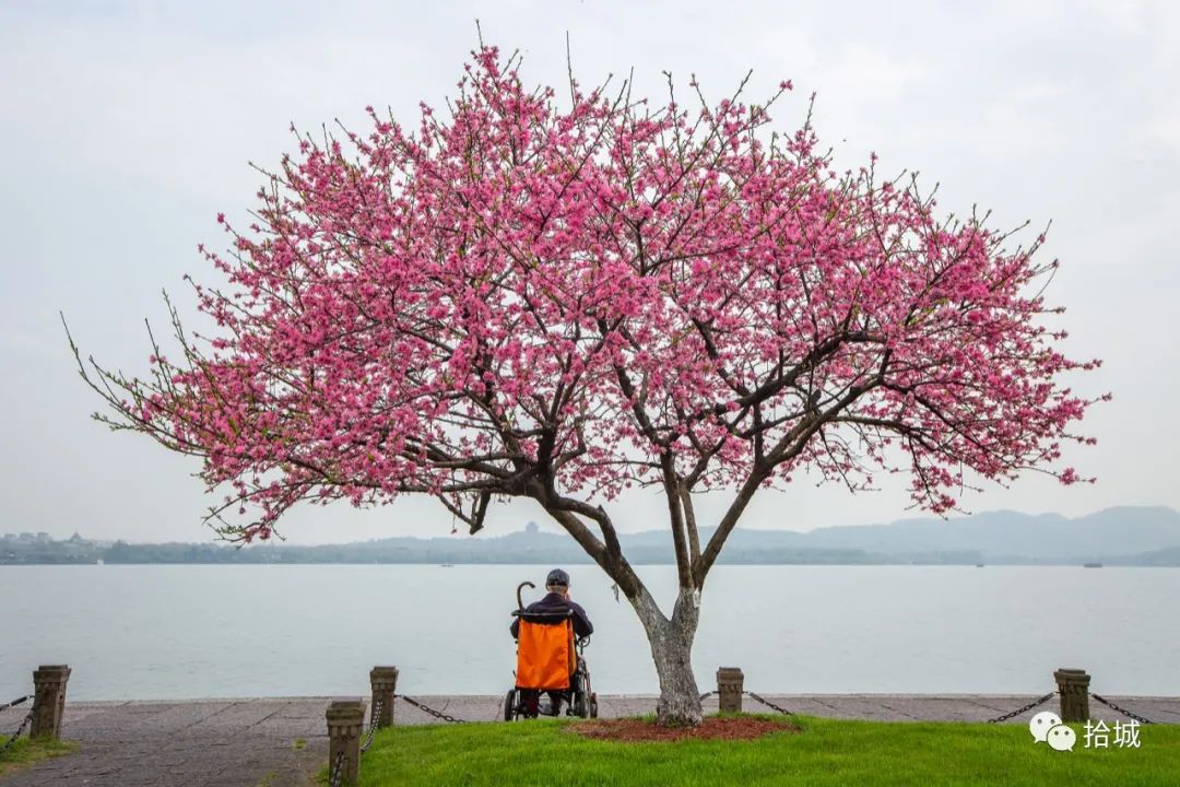 杭州- 2020年3月26日,西湖白堤,一位坐着轮椅的老人在桃花树下休息赏景。拾城 陈中秋