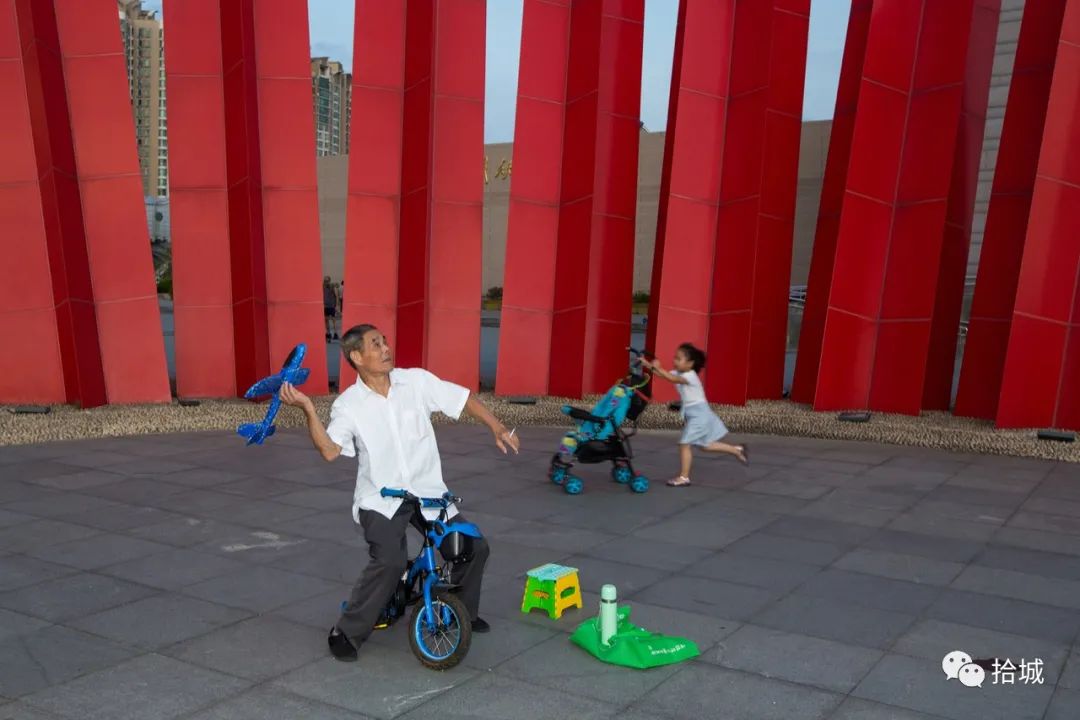 南京- 2018年8月18日,渡江战役纪念馆“千帆竞渡”群雕前,坐在儿童自行车上的一名老人准备投掷玩具飞机。拾城 陈中秋