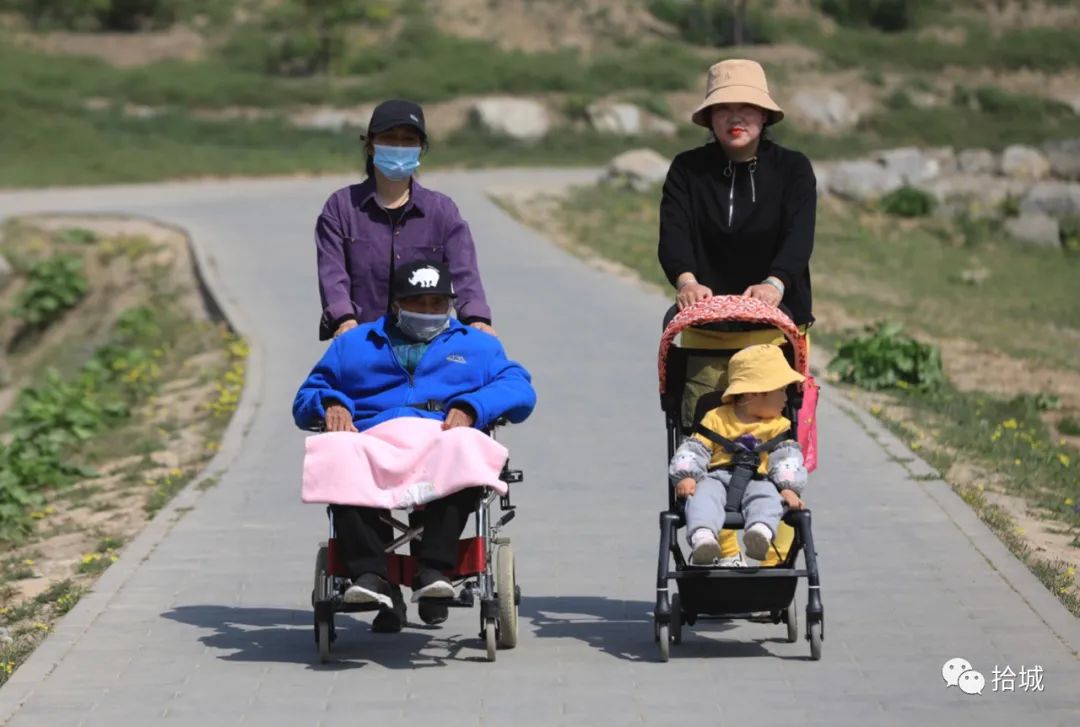 北京- 2021年4月19日,老人和小孩坐在推车里一起逛公园。拾城 浦峰