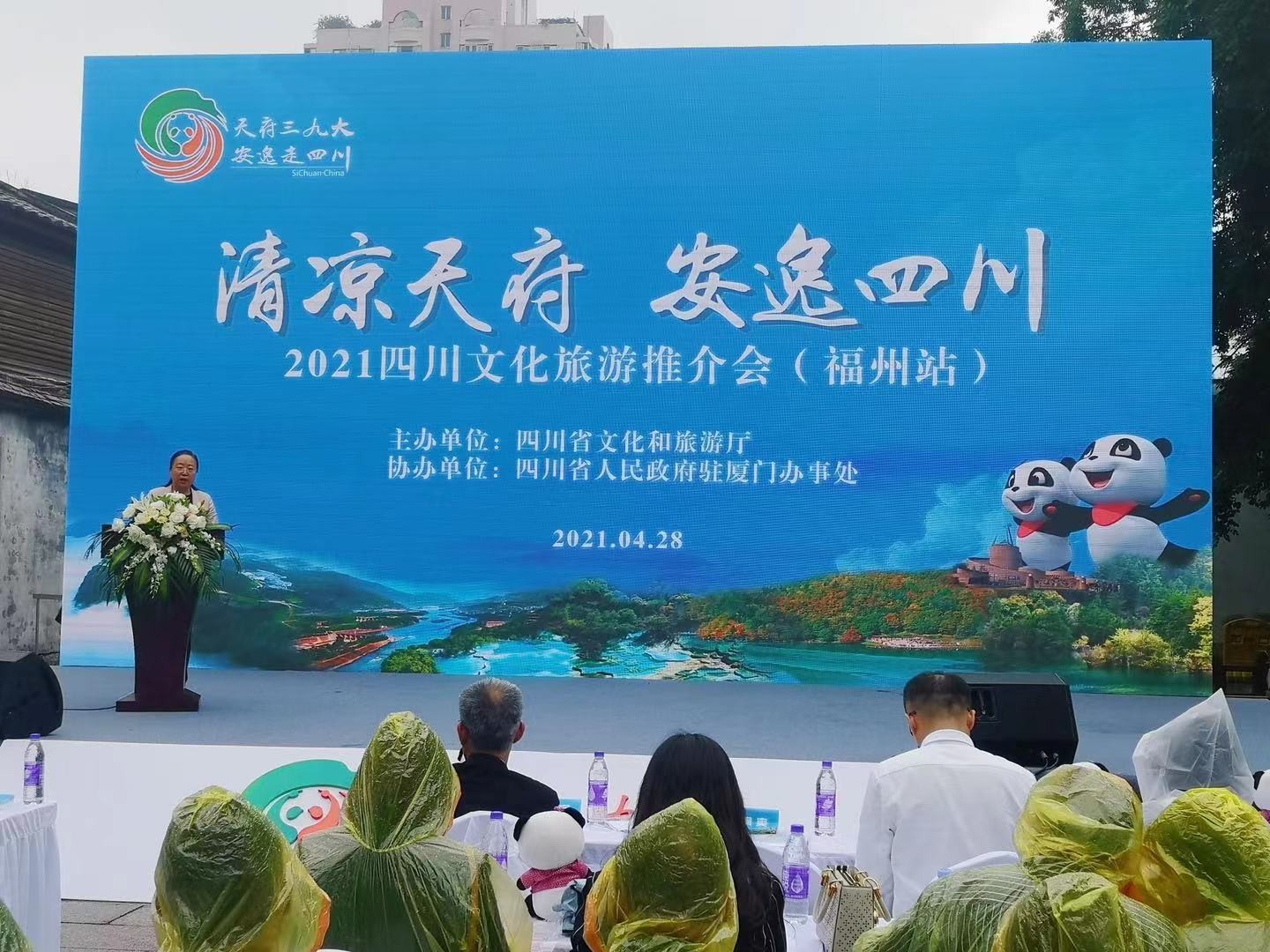 四川省文化和旅游厅党组成员、副厅长严飒爽在推介致辞中介绍,福建是海上丝绸之路的起点,四川是南方丝绸之路起点。古来今往,四川、福建之间往来一直不断,众多福建客家人扎根四川,为四川发展贡献了坚实力量。近年来,川闽两省不断加强交流合作,高铁直通、航空互通,让“蜀道难”的历史一去不复返,“一带一路”建设让四川和福建越走越近。未来,四川省文旅厅期待与福建省文化和旅游厅加强合作、资源互享、优势互补、宣传互推、客源互送,让两省间深化文旅交流合作,四川愿与福建同仁一道,着力推动川闽文化和旅游高质量发展。“欢迎大家到四川体验独特的“自然生态之美、多彩人文之韵”,观天府美景、品四川美食、享清凉之旅。”严飒爽发出热情邀请。
