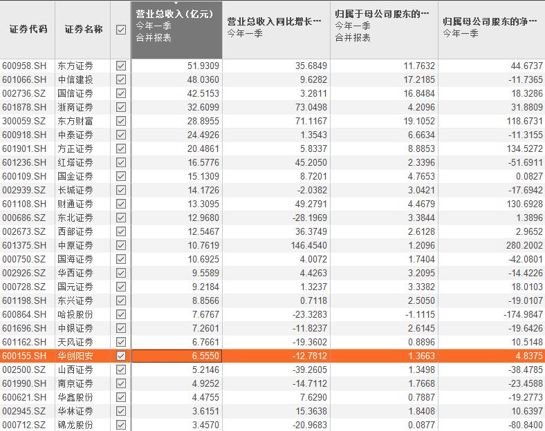 营收方面,23家券商同比增长,6家券商同比增幅超过50%;4家同比降幅超过20%,最高达39%。中信证券、海通证券、国泰君安营收排名居前,分别为164亿元、112亿元、109亿元,广发证券、招商证券、东方证券营收均超过50亿元。行业差距较大,12家券商一季度总营收小于10亿元。