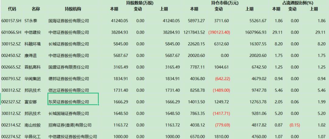 38家券商机构共计新增持55只个股,持仓市值共计75亿元。渤海证券增持3684万股中环股份,持仓市值10亿元。天邦股份被国泰君安、中金公司新增为重仓股,持仓市值共计8.7亿元。华泰证券、中金公司均新增重仓中国宝安,持仓市值共计3.28亿元。