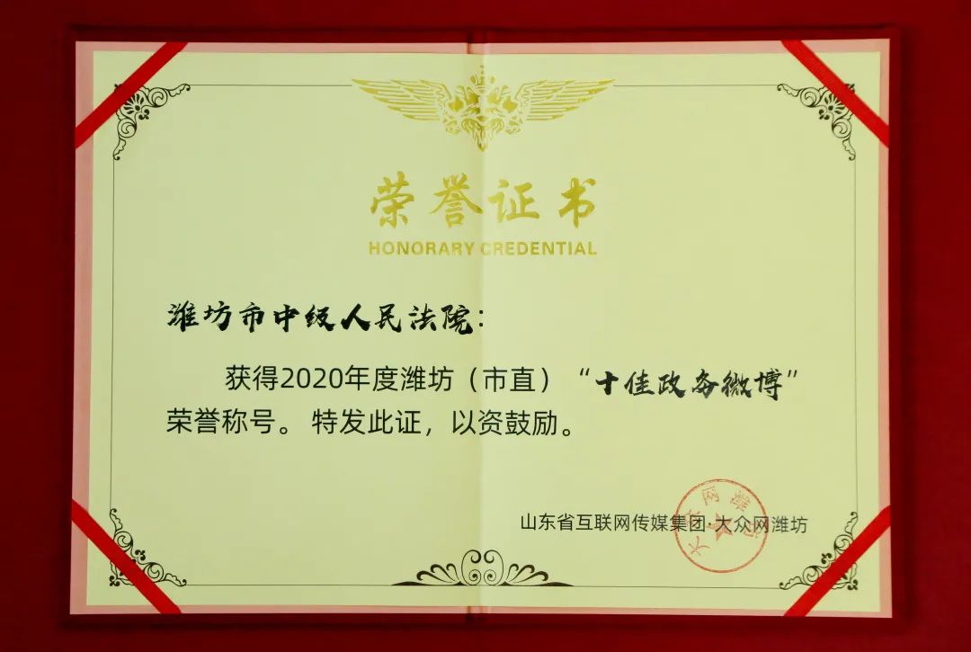 “潍坊市中级人民法院”获评2020年度潍坊(市直)十佳政务微博