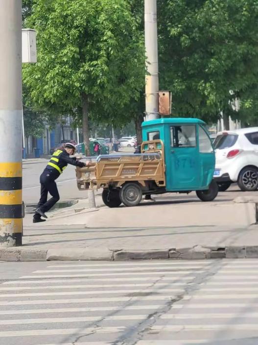 经询问,老人已年近七旬,本打算骑车去接孩子,没想到刚出家门电三轮就坏在了半路,老人无奈只好推着电三轮寻找修理店。马永辉见状,便帮助老人把电三轮推到附近的修理店,随后回到执勤岗位上继续工作。